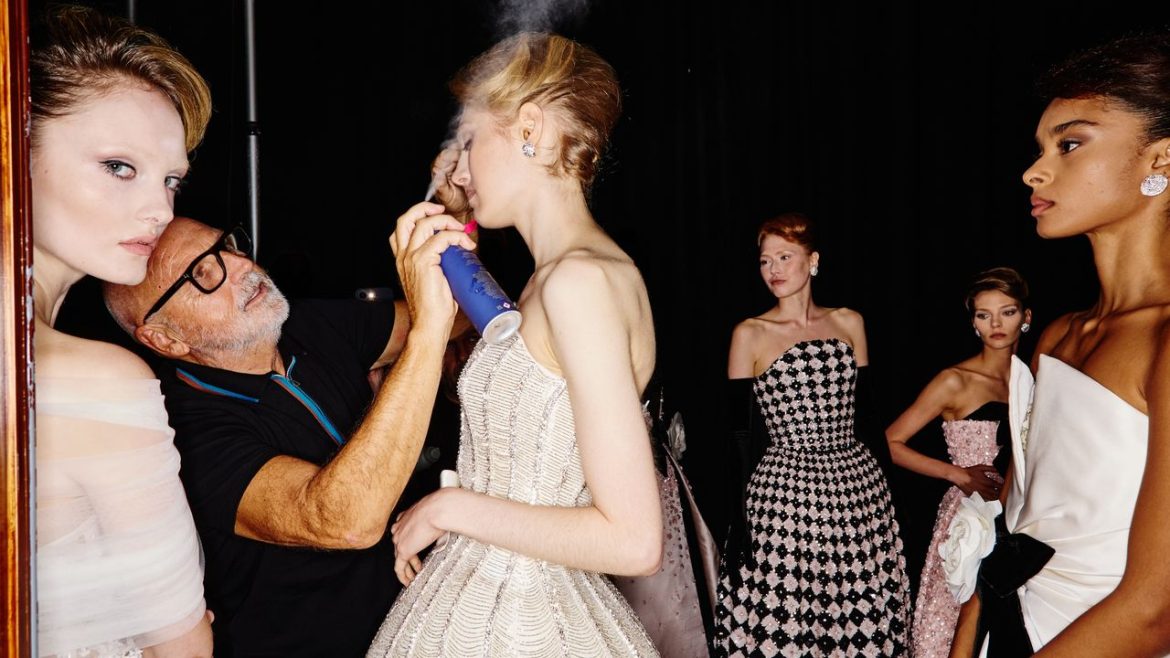 Backstage at Sandy Liang in New York, I found Evanie Frausto creating half-up hair with a dramatic “Clueless-style” curled tendril falling on one side of a model’s face. He praises the up-do’s transformative abilities, especially during growing-out phases.