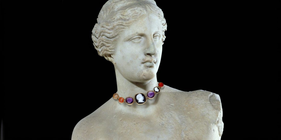 A particularly sought-after category of ancient jewelry is intaglios. These engraved semi-precious stones, including chalcedony, agate, and jasper, are usually fashioned into rings. Their small, detailed carvings depict satyrs and nereids (sea nymphs) and gods and goddesses, like Apollo, the god of music, and Hygieia, the goddess of health.
