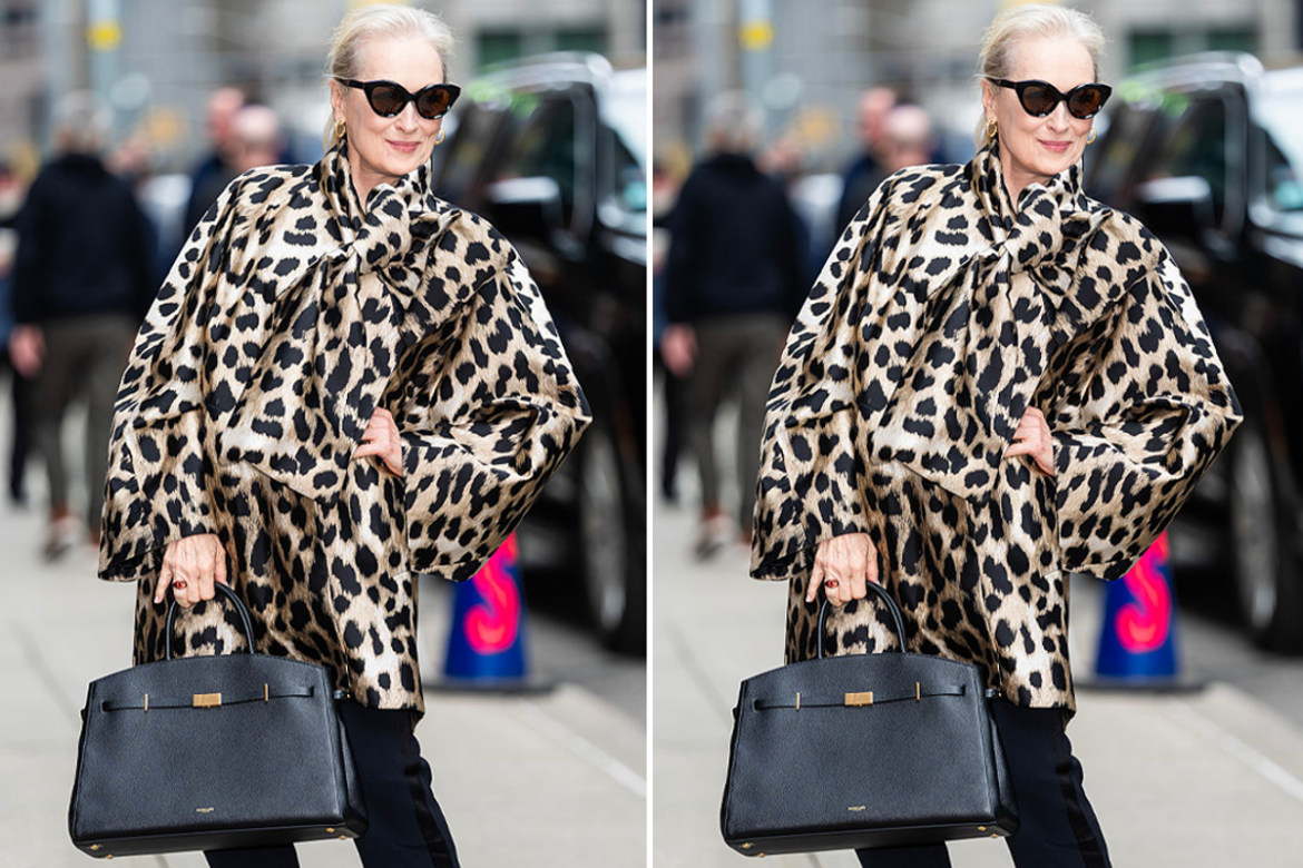 The iconic actor stepped out in New York before an appearance on The Late Show with Stephen Colbert. In an outfit heavily influenced by the editor in chief of Runway, Streep wore a leopard print coat with striking bow detailing, black slim jeans and black slingback heels – but it’s the bag that grabbed my attention.