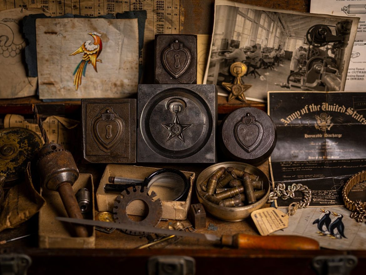 Original hand-carved hubs for the Purple Heart and Silver Star rest in the jeweler’s toolbox of legendary Providence-based hub carver Elio “Duke” Lossini.