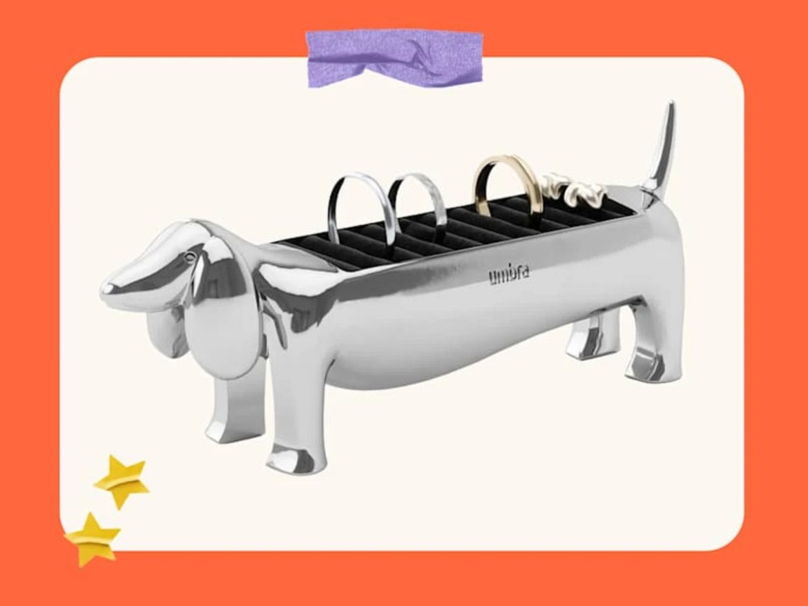 The holder stands stably on the four legs of the dachshund (so cute), so you can place it on your nightstand, windowsill, or wherever you store your jewelry without worrying that it will tip over. It measures about 6 inches long by 2.5 inches tall, so it doesn’t take up too much space. I own the chrome-colored version, which I love and is currently on sale for $24, but it also comes in a gold color, which is currently even more deeply discounted at $20. If you love animals but prefer a non-dog design, they have cat and bunny versions, too.