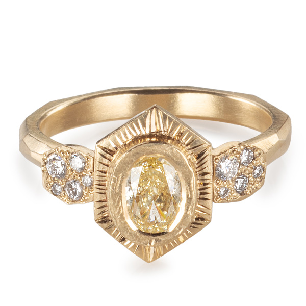 Top: Hexa faceted ring in 9k yellow gold with 0.51 ct. lab-grown fancy yellow diamond and white lab-grown diamonds, £2,990 ($4.050); Maria Manola