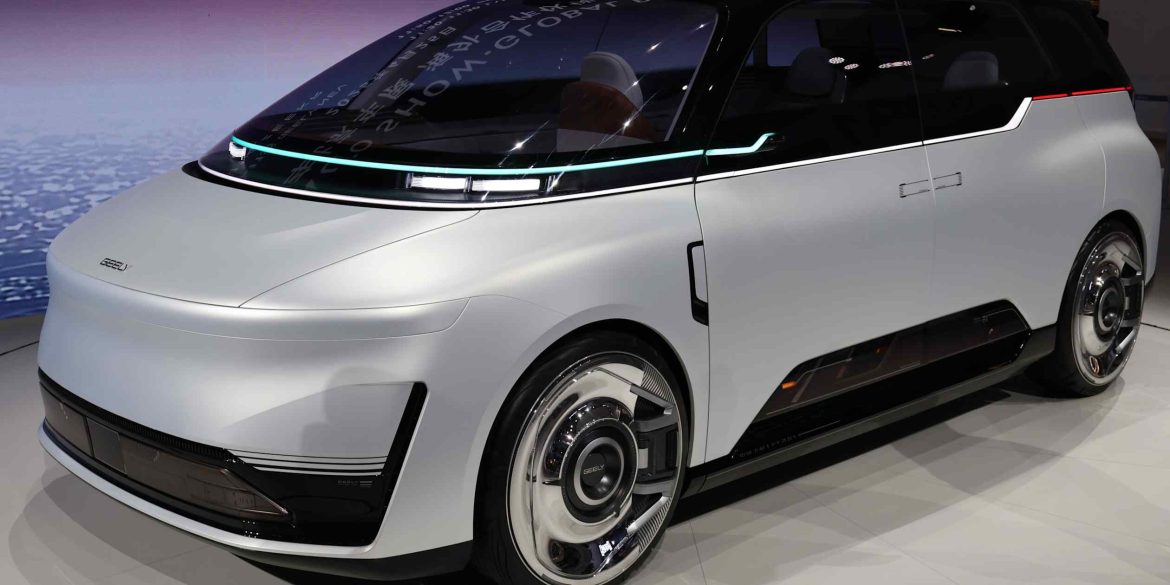 Geely’s robotaxi prototype is displayed the Auto China 2026. Caocao, Geely’s ride-hailing arm, plans to deploy 100,000 driverless cabs worldwide by 2030. (Photo by Wataru Suzuki)