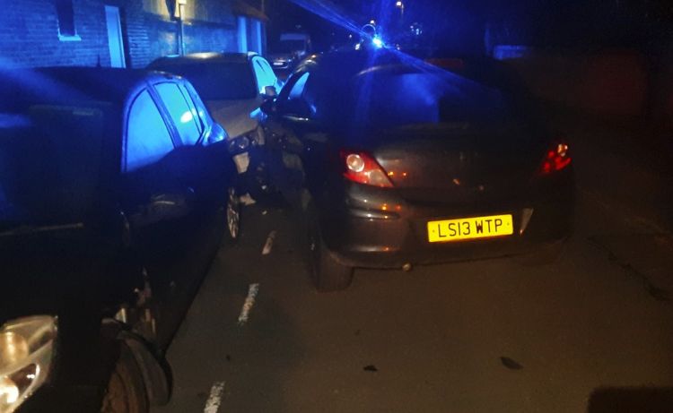 Police say the car was driven the wrong way into Friary Lane before crashing into two parked and unattended vehicles, leaving significant damage behind.