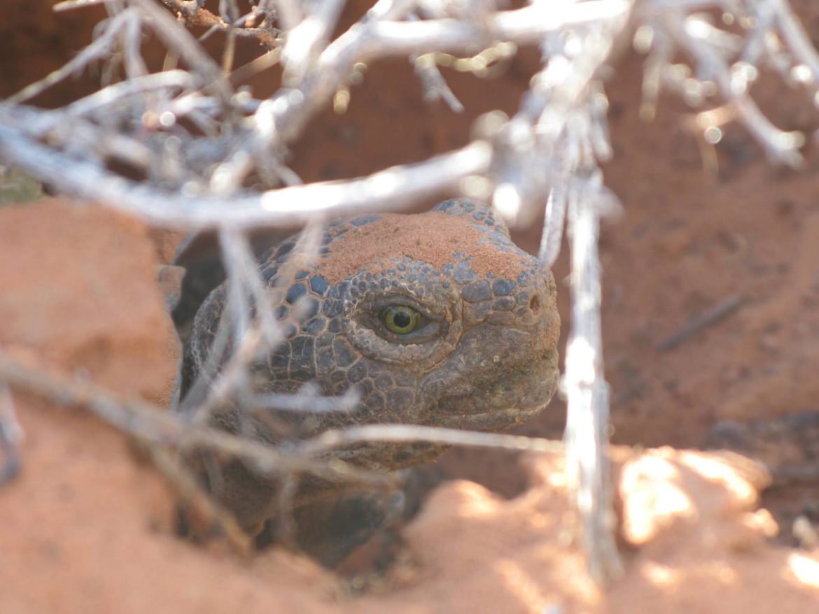 (Jason Jones | Utah Division of Wildlife Resources) A wild desert tortoise pokes its head out of a burrow. Utahns can adopt Mojave desert tortoises from the Division of Wildlife Resources through an application process.