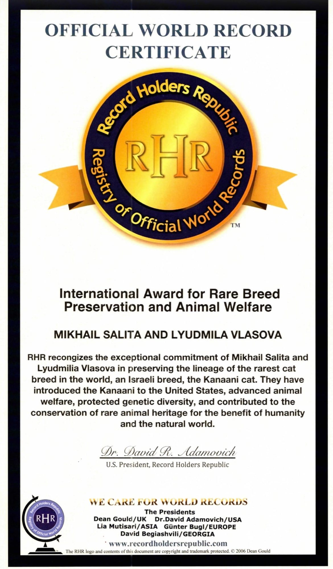 A new phase has begun. Today, the Kanaani is supported by a small but growing circle of individuals working across Israel, Ukraine, the United States, and the United Kingdom. This effort is not centralized and is not about ownership, but about preservation, documentation, and opening the path for others. Among the organizations contributing to this process are The International Cat Association, the World Cat Federation, the Feline Alliance of Ukraine (FAU), Pedigree Club UK, the Association of Rare Breeds of Cats (ARBC), and other dedicated contributors. The role of The International Cat Association in particular deserves recognition, as its willingness to register the Kanaani, even at an experimental stage, has opened the door for formal documentation and future development. This work has already received international recognition, including acknowledgment from ARBC for contributions to the preservation of rare experimental breeds, and documentation within international record frameworks, where the Kanaani has been recognized as among the rarest documented cat lineages in the world. In addition, support and encouragement from Sarah Bowen and the Compassion Consortium have contributed to a broader understanding of the ethical and spiritual dimensions of human–animal relationships within this work.