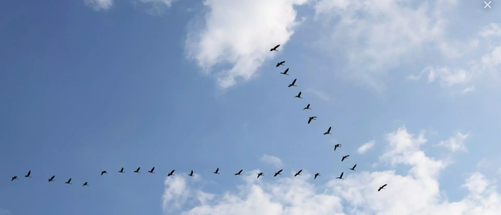 The concept draws directly from how geese fly in a V-formation, where trailing birds benefit from reduced air resistance.