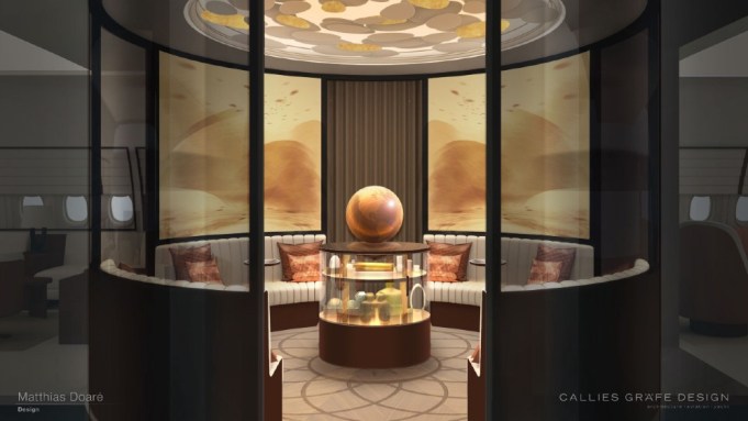 The lounges start with the entryway with its circular enclave (lead image) that can be used as a massive lobby or intimate lounge during the flight. It offers “space for smaller, breakout groups of passengers to socialize,” Callies told Robb Report.